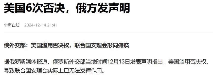 《美国6次否决,俄方发声明》华声在线2024-12-14