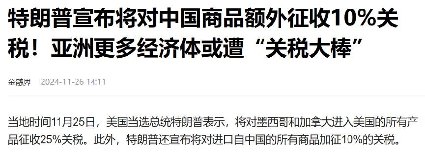 《特朗普宣布将对中国商品额外征收10%关税!亚洲更多经济体或遭“关税大棒”》金融界2024-11-26