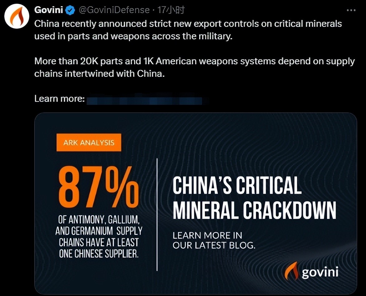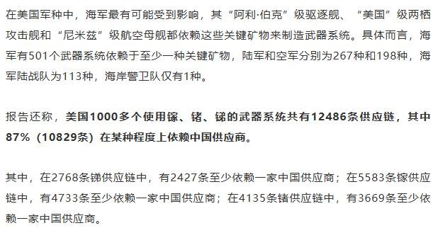 据美国国防情报公司戈维尼发布报告称:中国对美国所采取的关键矿产禁令将对美军内部1000余个武器制造系统和超过2万个装备零部件生产构成影响。