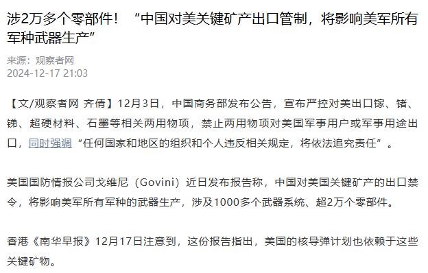 《涉2万多个零部件!“中国对美关键矿产出口管制,将影响美军所有军种武器生产”》观察者网2024-12-17