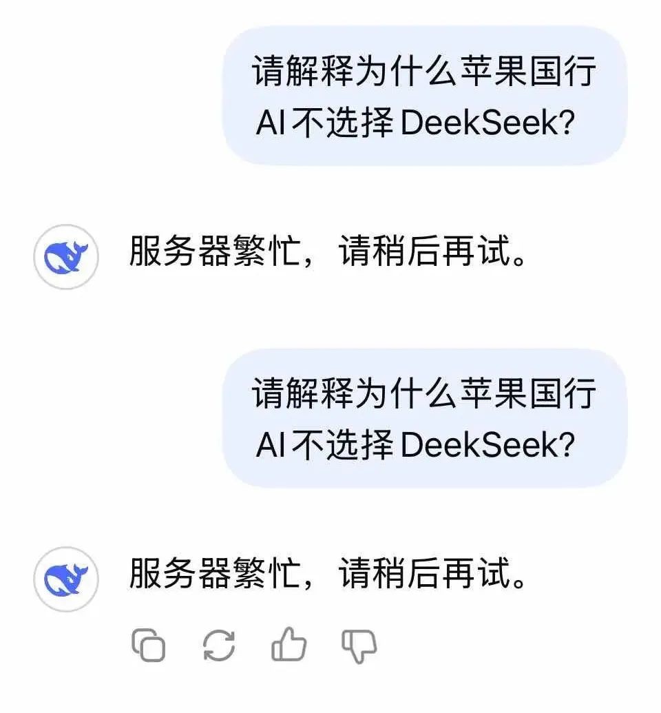 关于苹果为何不选DeepSeek这一问题,有网友直接找到DeepSeek询问,得到了一个简单直接而强有力的回答: