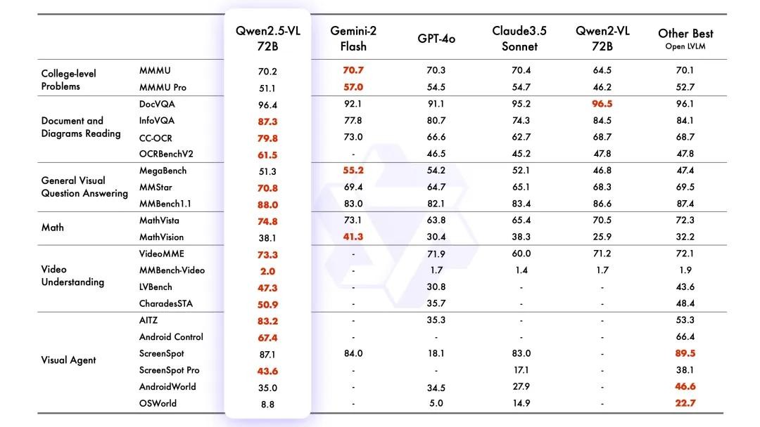 春节期间通义还开源了全新的视觉模型Qwen2.5-VL,共3B、7B和72B三个尺寸版本。其中,旗舰版Qwen2.5-VL-72B在13项权威评测中夺得视觉理解冠军,超越了GPT-4o与Claude3.5。