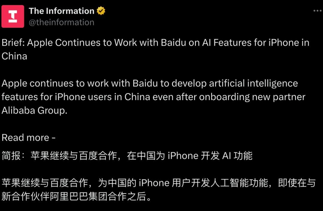 2月13日,据外媒The Information报道,苹果将会与百度和阿里共同合作,为国行iPhone开发AI功能。