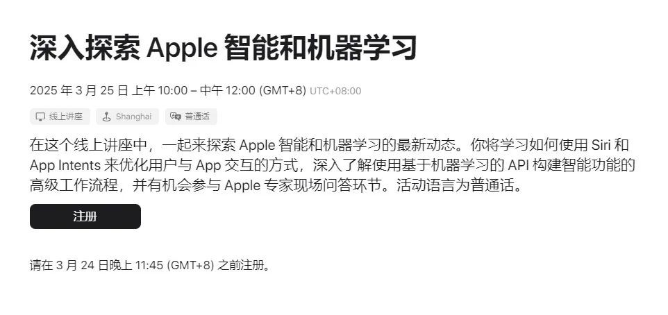 除了Siri,开发者活动的邀请函中还有“深入学习基于机器学习的API构建智能功能的高级工作流程”,则很有可能是为开发者介绍如何将软件与Apple智能结合打造更智能的软件。