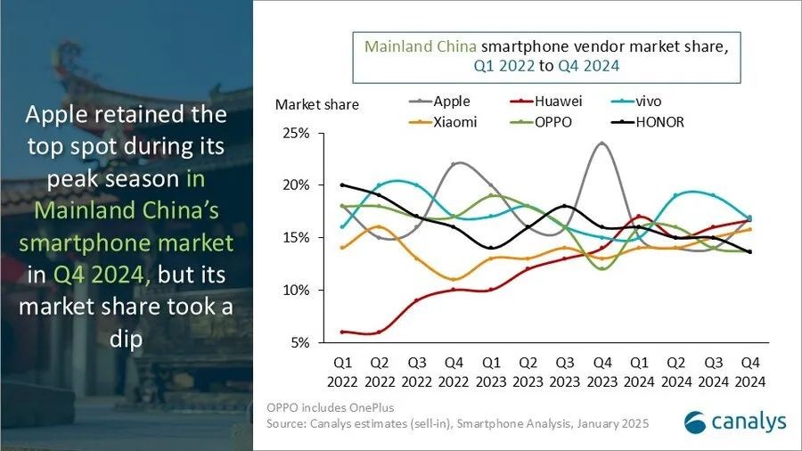 在最新的Canalys统计数据中,2024年第四季度中国智能手机出货量同比上升4%,华为、小米、OPPO、vivo等国产品牌手机出货量均出现上涨,但苹果出货量却同比下跌25%。