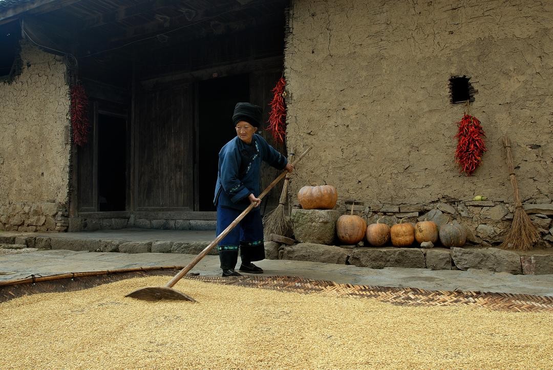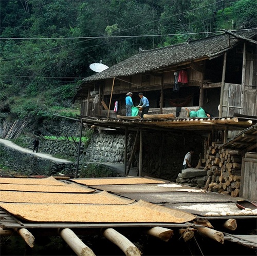 2014年,古丈翁草村,村民在村部坪场晒苞谷