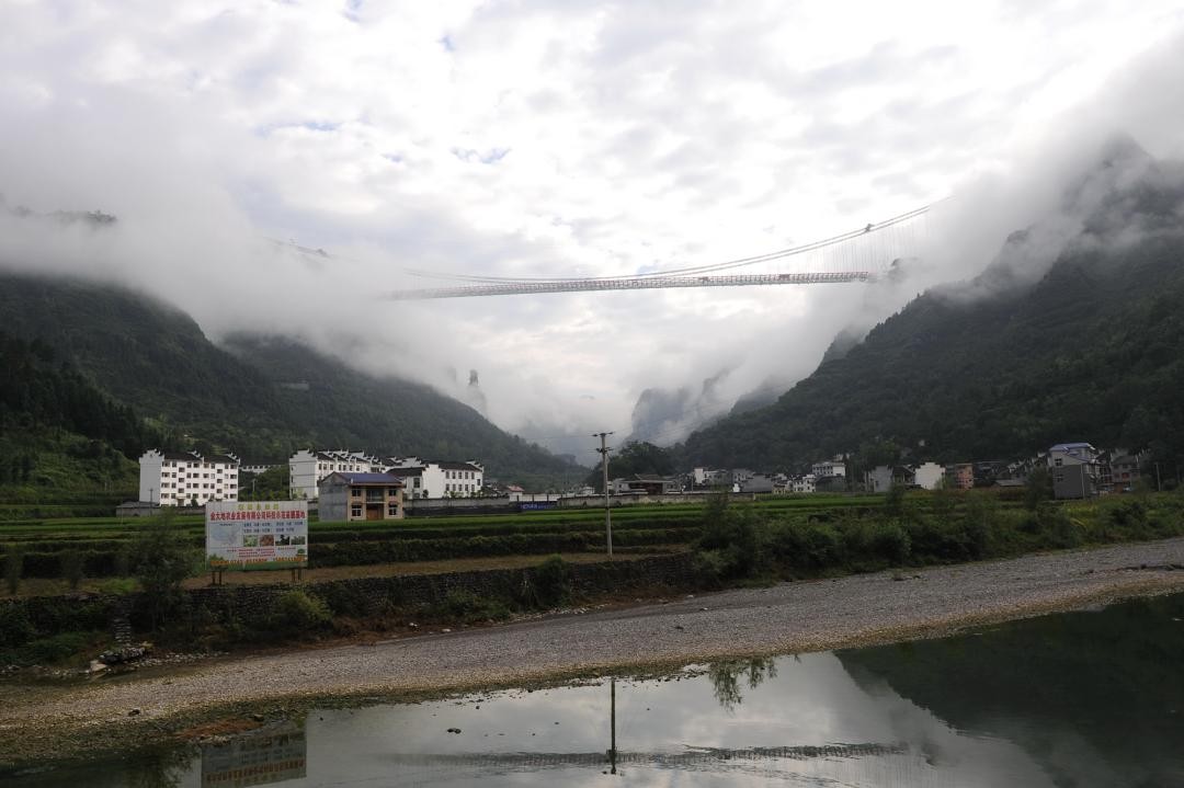 2011年,从峒河边拍摄晨雾中的吉茶高速公路矮寨特大桥,大桥横跨德夯大峡谷