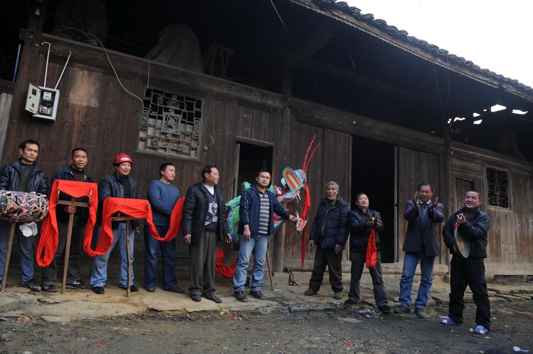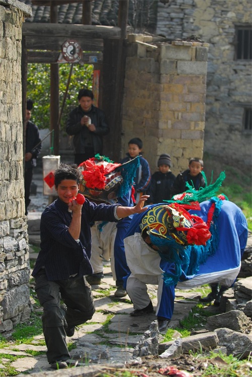 2013年,凤凰拉壕,农历正月里村民玩狮子拜年,拉毫为清代南方长城驻兵要塞