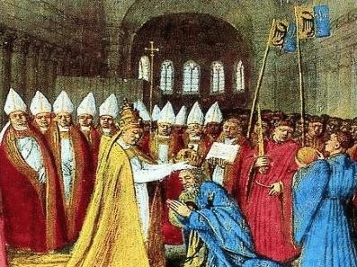 警如,加洛林君主为罗马提供军事庇护,罗马则以膏立礼圣化加洛林家族,为加洛林王朝的统治提供代表神权的合法性支持。