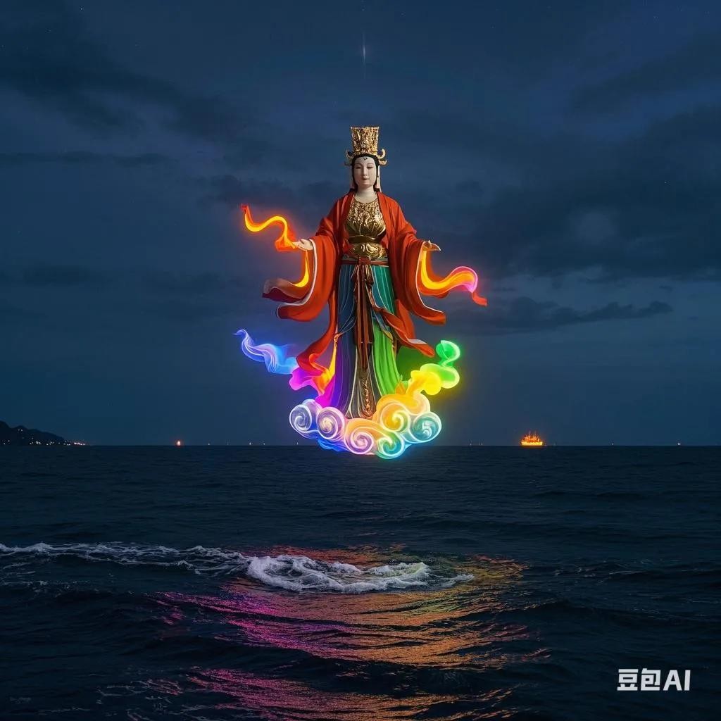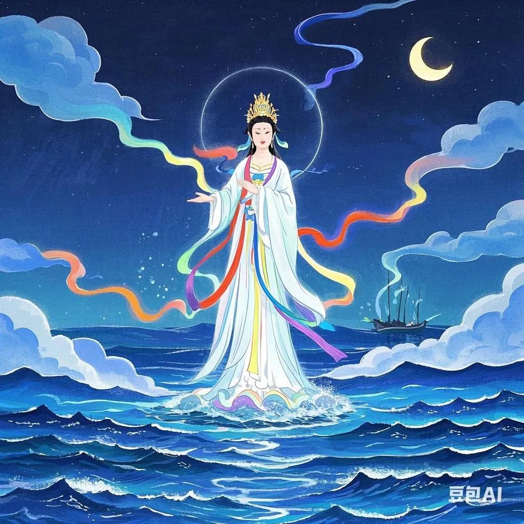 祥云中,妈祖娘娘站在云朵中微笑着对他说:“郑芝龙,前几日你救了我的鲸将军。今日我带它来让它报恩。”