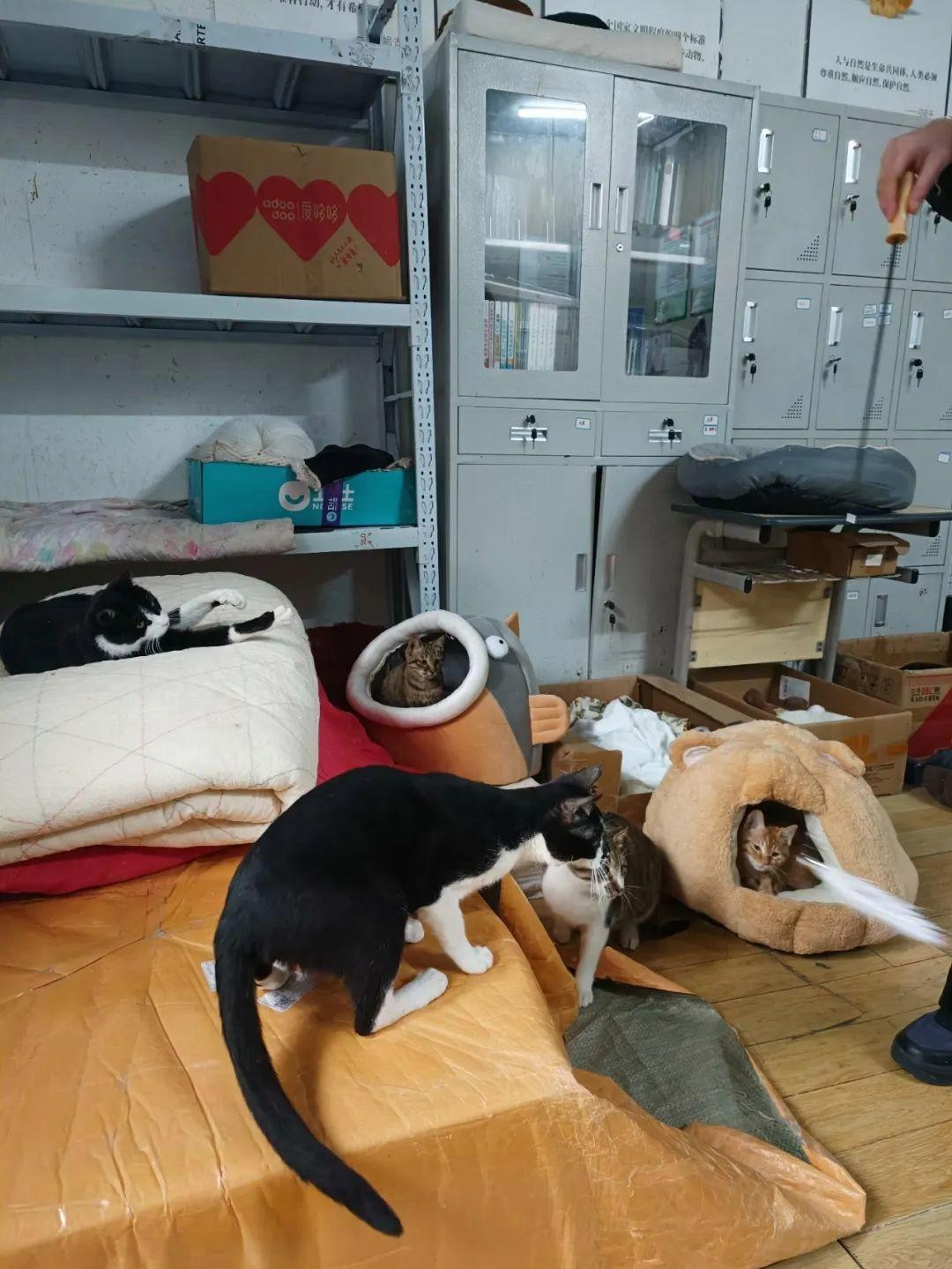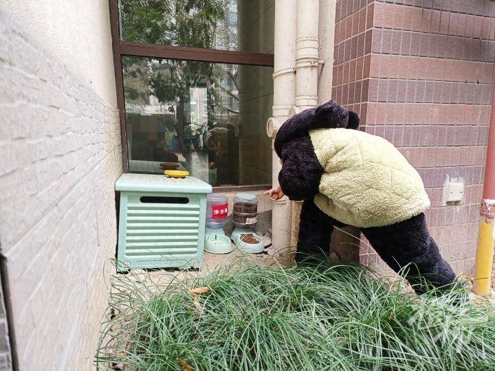 “流浪猫进入安置点后,有的会被人领养,有的会在安置点看护,有的经过绝育后再放归小区,小区内还有一二十个流浪猫投喂点,有猫舍、猫粮。”