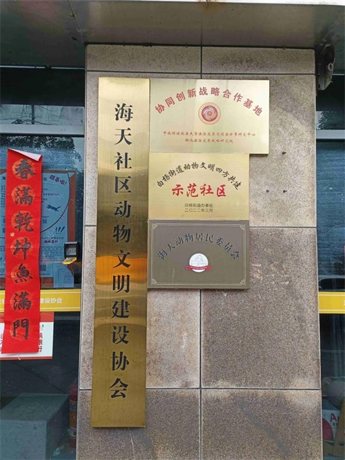 海天城一间沿街商铺,挂着“海天社区动物文明建设协会”(以下简称“动文会”)招牌,门口还挂着“协同创新战略合作基地”“白杨街道动物文明四方共建示范社区”及“海天动物居民委员会”三块牌子。