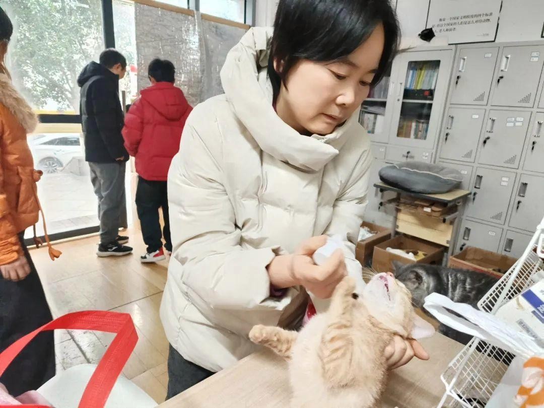 “之前我没养过动物,在这里就是奉献爱心,大家都不拿工资,有时还会为猫咪买吃的,协会的工作人员都是倒贴服务的。流浪猫被抓捕到这里,生病的就要治疗,重病的被送到宠物医院,隔壁有个独立房间是病患区,有十只在治疗的猫,患有口炎、慢性鼻炎、贫血和传腹等疾病。身体健康、符合条件的流浪猫会被送去宠物医院做绝育手术,我们有个‘动物居民’小程序,会发布健康猫咪的领养信息,有的流浪猫会被爱心人士领养,没被领养又在室内待不住的会放归。有的流浪猫很小就来‘动文会’了,现在还不适应野外生存放归,还有的因为身体免疫力低不适合放归,都会在‘动文会’生活。放归的流浪猫在小区还有一二十个喂养点,有志愿者负责喂养。”