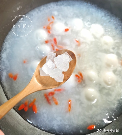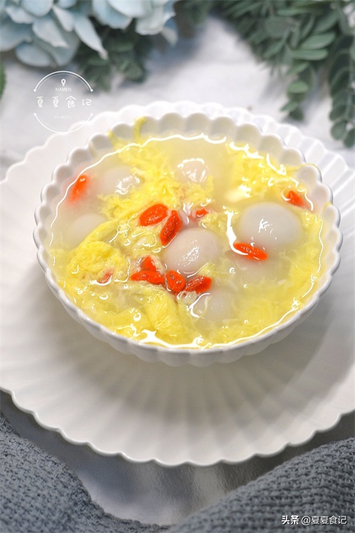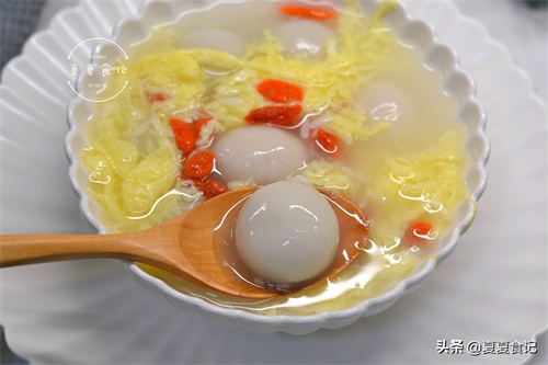 这是汤圆最传统的一种吃法,加入酒酿(米酒、醪糟)、枸杞、蛋液、冰糖,煮出来的口感,清甜顺滑,非常的好喝。