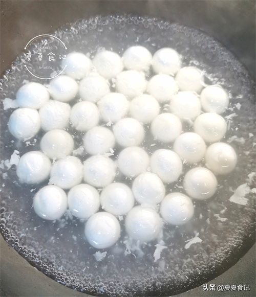 2、 水开下入汤圆,轻轻用勺子背部推动一下汤圆,以免粘锅,煮开后,淋上一碗清水,这样反复三次,汤圆就煮好了(然后我们盛出来一些汤圆做后面几种吃法,所以一次把汤圆都煮好了,其他吃法不用再煮汤圆)。