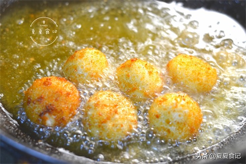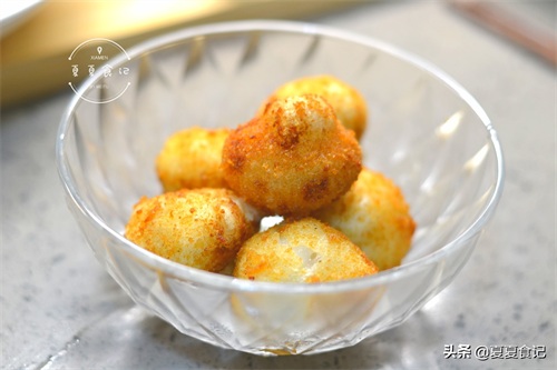 汤圆煮熟后,裹上面包糠,然后下油锅炸至金黄出锅。这种汤圆非常好吃,但油炸热量高,好吃也要少吃哦。