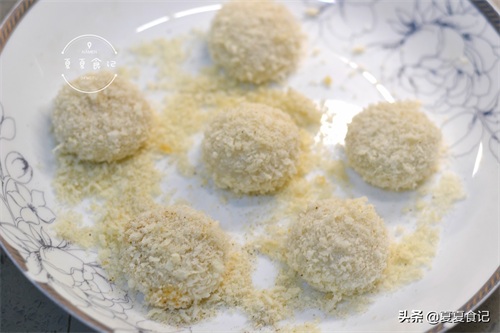 1、 在盘子里放上面包糠,然后将煮熟的汤圆放入面包糠中裹匀。