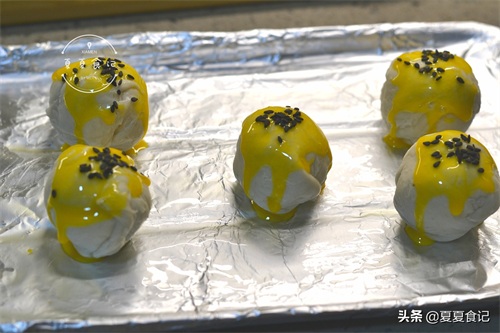 3、 烤盘放好锡纸,刷油,将包好的汤圆放在烤盘上,刷上一层蛋黄液,撒上黑芝麻。