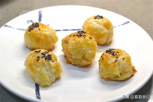 手抓饼切成小块,包住汤圆,然后刷上蛋液,撒上黑芝麻,放入烤箱烤20分钟,即可开吃,这种做法,需要选择咸味的汤圆,我用甜的汤圆,所以烤出来真是五味杂陈不好吃。这个耗时长,如果换成咸味的应该也还好吃。