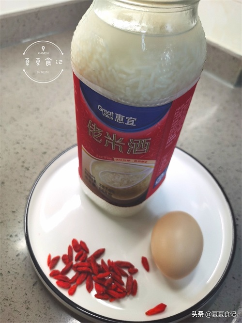 1、 准备好材料:1瓶米酒,1个鸡蛋,1小把枸杞,几块冰糖。