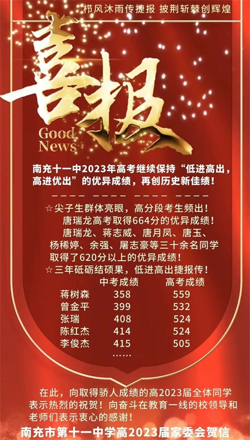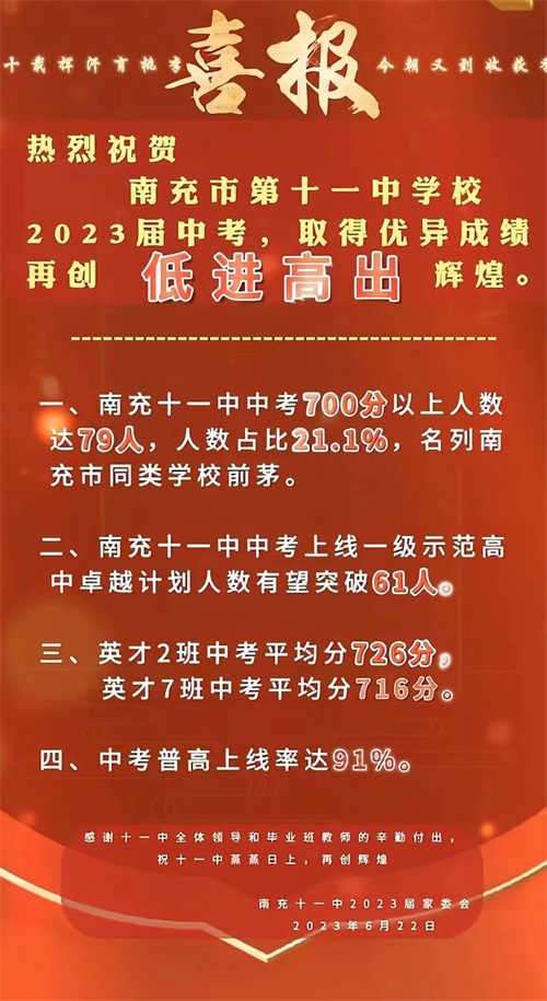 01辉煌的教学业绩:南充十一中高考成绩连续十八年名列南充市同类学校第一名。近年来,彭琴、张程、张非考入清华大学,李海林、刘钊燕考入北京大学,何登建考入中科大,吴九龙考入复旦大学,黄倩考入南开大学,我校共计1200人考入全国一流重点大学,7000余名学子被全国知名本科院校录取。2019年高考,高坪区理科前十名,十一中进入5人,其中我校学生黄倩(高考总分683)、任锦阳(高考总分681)、孙曾恩(高考总分674)、王博(高考总分666)、郭利民(高考总分665)分别荣获高坪区理科应届高考总分高坪区第二名、第三名、第四名、第六名、第八名的优异成绩,文科前十名,十一中进入3人。2020年高考,南充十一中再创辉煌,高坪区理科前十名,十一中进入5人,其中我校学生张博(高考总分648)、李航(高考总分648)、刘海燕(高考总分643)、青彬(高考总分643)、杨源(高考总分641)分别荣获高坪区理科应届高考总分高坪区第三名、第五名、第八名的优异成绩;文科前五名,十一中进入2人,全校920人参加高考,本科上线490人,重本上线176人,其中一类火箭班本科上线率100%,重本上线率95%。2021年高考,南充十一中乘势而上。吕琳(高考总分661)、刘祥(高考总分660)跻身高坪区理科前5名,全校950人参加高考,本科上线580人,重本上线182人,一类火箭班本科上线100%,重本上线率达98%。