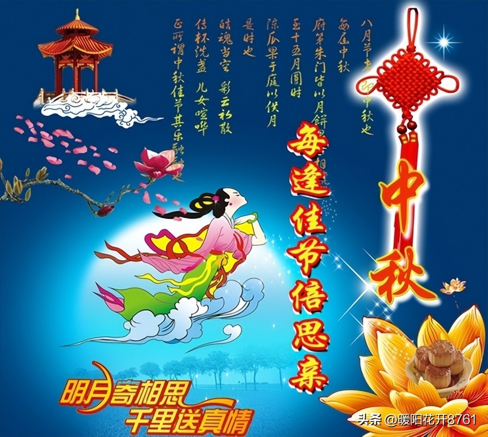 2、月月有十五,中秋月更圆;年年庆中秋,今朝夜最欢,。佳节共祝愿,人月皆圆满!