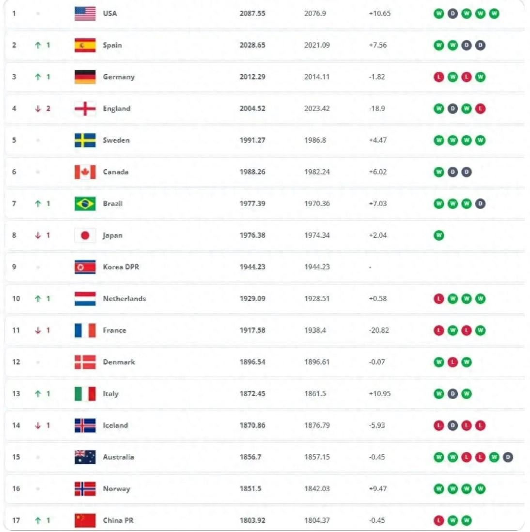 17. 中国:中国女足上升1位至第十七名,在亚洲排名第三,这体现了中国女足的不断进步和努力.