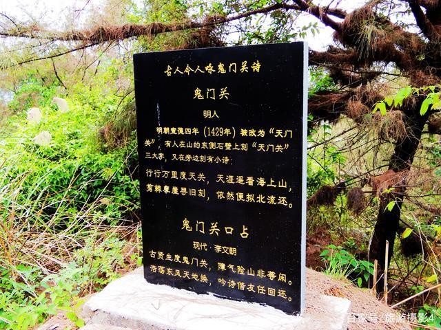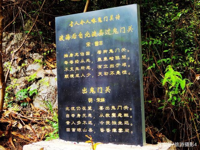 在今天的天门关(即古代鬼门关)处,石壁上刻有"天门关"三个大字,格分醒目。而在"天门关"三个大字旁边,原来还刻有一首古诗:“行行万里度天关,天涯遥看海上山,剪棘摩崖寻旧刻,依然便拟北流还。”这首古诗历经岁月冲洗、风吹雨打、日晒雨淋,已经变得模糊不清了。