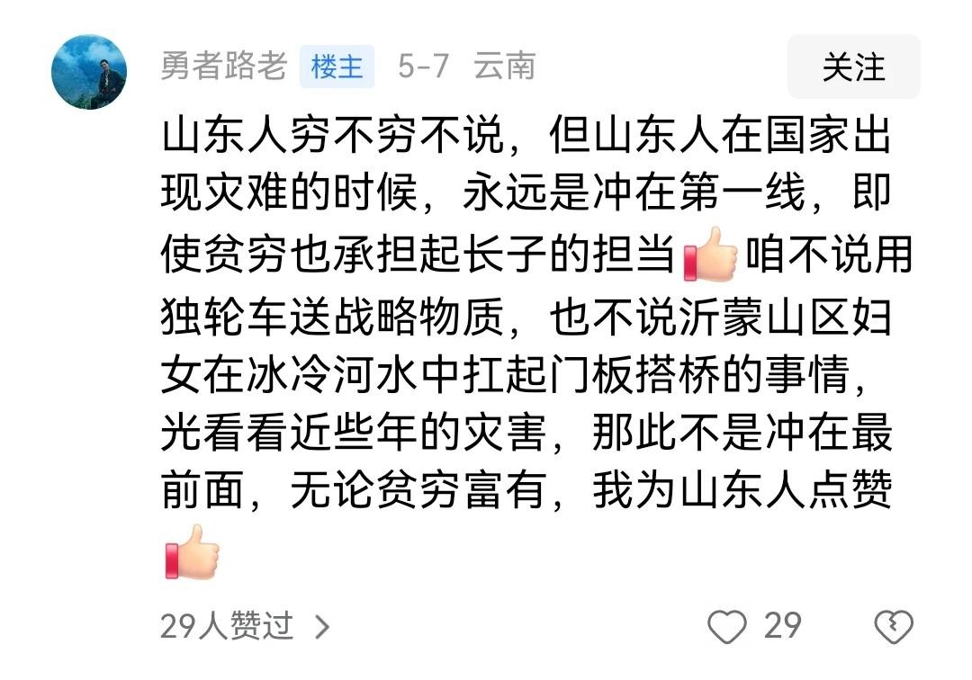 这位云南网友总结的很好,他说:山东人穷不穷不说,但山东人在国家出现灾难的时候,永远是冲在第一线,即使贫穷也承担起长子的担当。咱不说用独轮车送战略物质,也不说沂蒙山区妇女在冰冷河水中扛起门板搭桥的事情,光看看近些年的灾害,哪次不是冲在最前面,无论贫穷富有,我为山东人点赞。