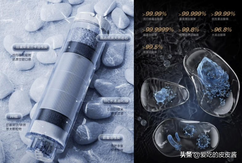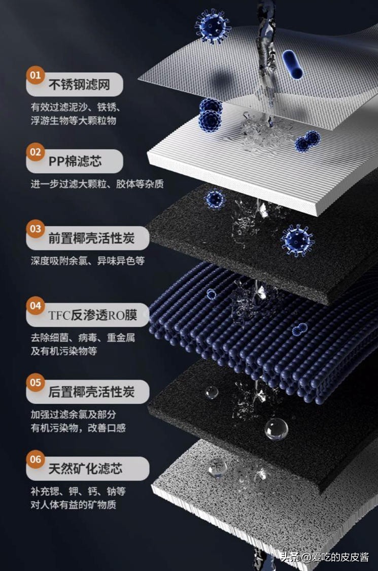 其中,这6重过滤分别是水箱进水口的不锈钢滤网、聚酯纤维、阻垢活性炭、RO+反渗透滤芯、椰壳活性炭、矿化滤芯,净水效果特别好,达到国家直饮水标准。