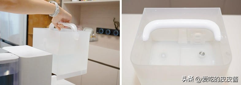 令人安心的是大容量的原水箱,采用了抑菌磨砂材质,不易滋生细菌及海藻类微生物,而水箱的底部则采用了隔板分离式设计,通过物理隔断,有效避免废水和纯水混合,并且还设有圆润提手,完全高于水平面,方便倒水加水。(ps:废水可以用来浇花哦)