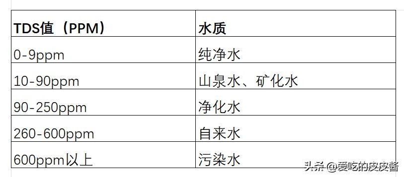 首当其冲则是水质TDS(溶解性固体总量)测试,是考量水质好坏的重要标准之一,也能够反映水中含有的杂质浓度,但不能确认这些杂质是否有害,其数值代表的不同水质可看上表。