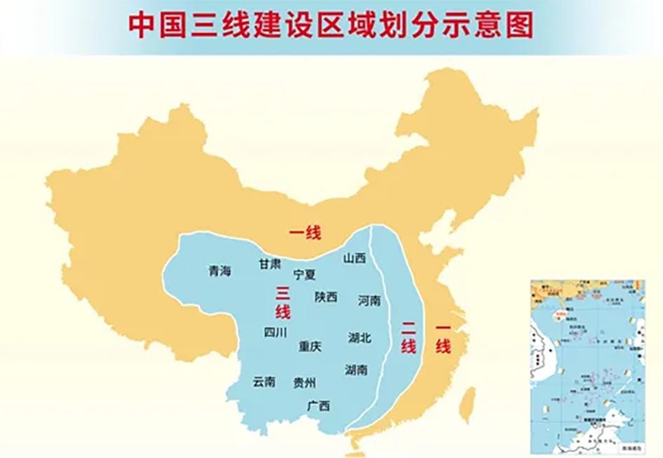 而所谓的三线地区就是:“京广线以西、甘肃省的乌鞘岭以东和山西省雁门关以南、贵州南岭以北的广大地区。”(一线为沿海和边疆地区,二线为一线和三线之间的地区。)