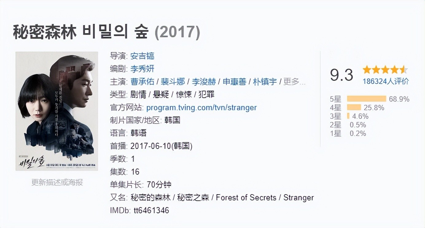 《秘密森林》在2017年7月份一经播出,同步引进到中国后,就被中国网友打出了9.1的高分。