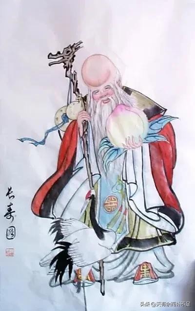 执掌人生死寿天的神仙被称为寿星,也叫南极仙翁。寿星面色红润、面目慈祥,他的样子看起来有点滑稽可笑,头跟身子几乎一样长,额头高高隆起,一手拿着系着一个大葫芦的拐杖,一手捧着灵芝或蟠桃,梅花鹿、仙鹤、灵龟等寓意吉祥和长寿的动物伴随着他。这个笑容可掬、和蔼可亲的寿星是幸福安康的象征,是中国老百姓最喜闻乐见的形象之一。