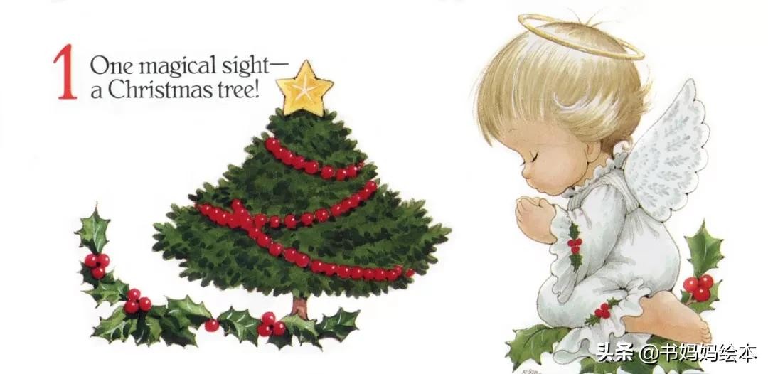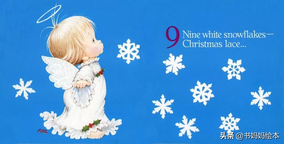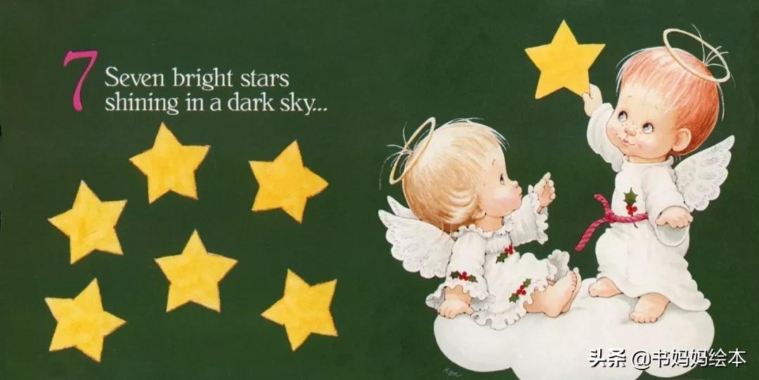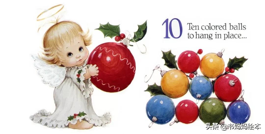 绘本介绍:10个美丽可爱的彩球挂起来了,9朵白色的雪花——圣诞花飘起来了,8只小鸟在树枝啁啾,7颗明亮的星星在夜空闪烁。