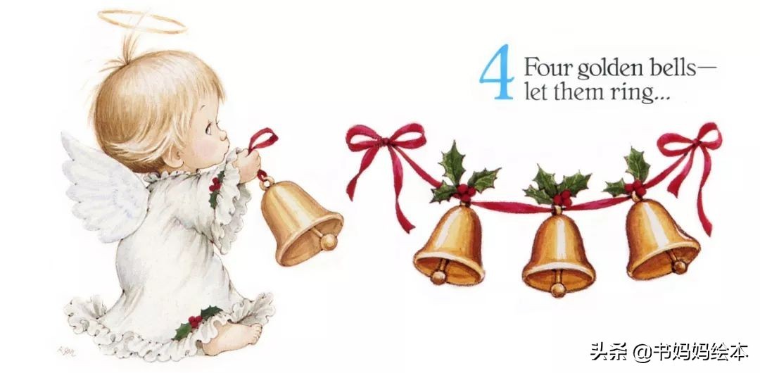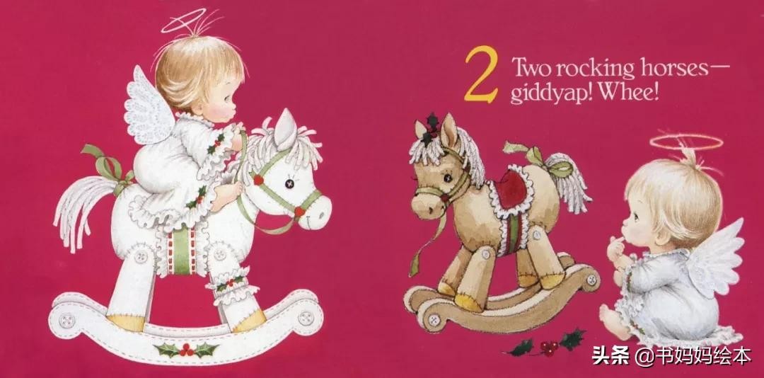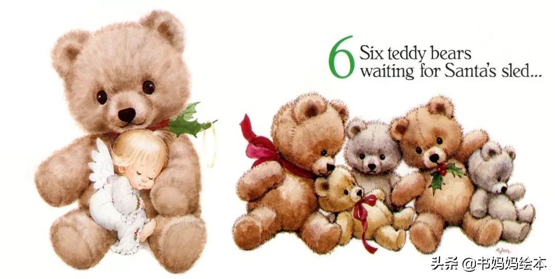 6只泰迪小熊在等待圣诞老人的雪橇,5只小羔羊在回家的路上,四只金色的铃铛—让它们响起,三只小猫系上花环,两匹摇晃的小马—驾!哟呵,一幅奇妙的影像——还有一棵圣诞树!