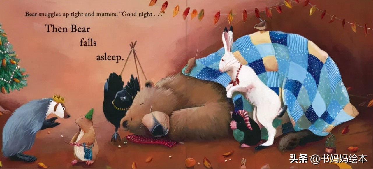 绘本介绍:Bear Stays Up for Christmas讲的是已经冬眠的熊醒来,和朋友们一起过圣诞节的故事。大熊要冬眠了,但是动物朋友们为了准备圣诞礼物,要他保持清醒,大熊通过给朋友们准备礼物,忙活了很长时间,付出了很多劳动和心血,最后把礼物分享给了每个朋友。