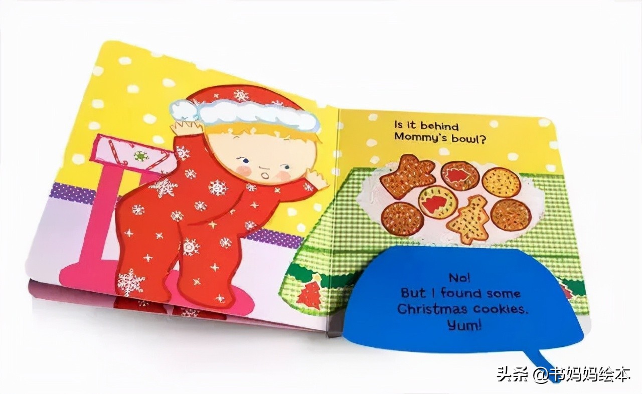 礼物藏在柜子里面吗?柜子里装的是装饰球啊!礼物藏在妈妈的碗后面吗?碗后面是一些曲奇饼啊……随着一问一答,宝宝能学会很多跟圣诞相关的单词噢!