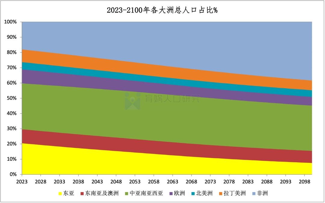 下图是2023-2100年各大洲总人口占全球比例预测,其中,亚太地区分为东亚、东南亚及澳洲、中亚南亚西亚三个部分。