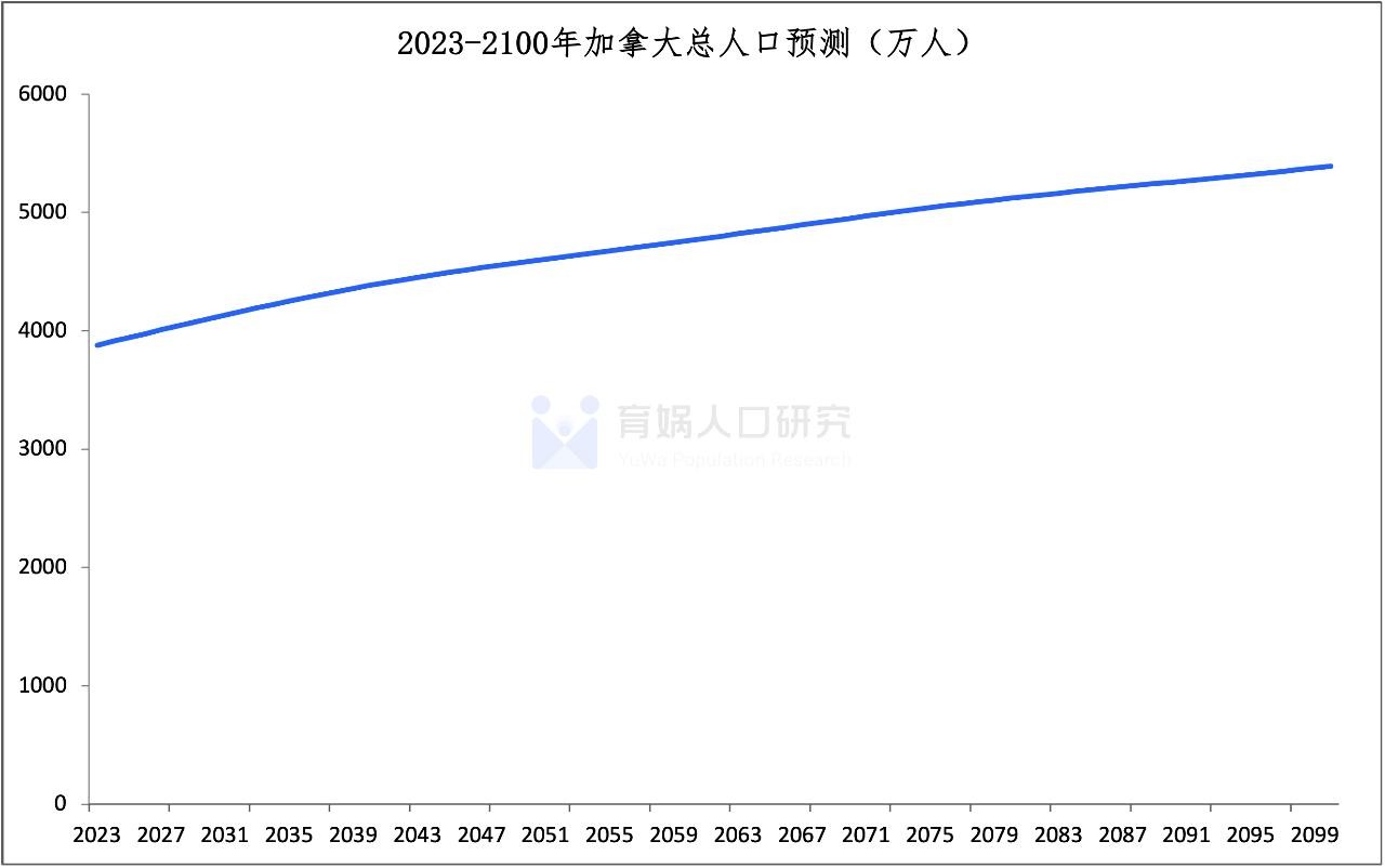 根据上述预测,从2023-2100年,加拿大总人口从3878万缓慢上升到5390万。