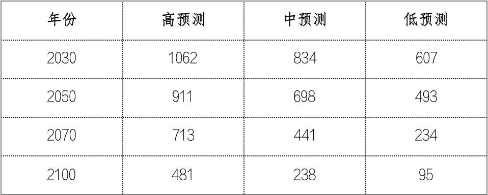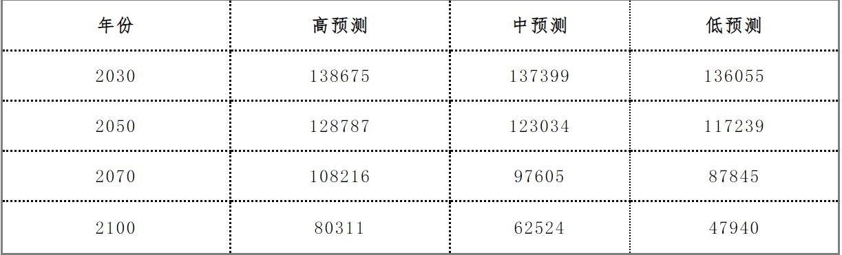 在中预测的情形下,中国总人口到2050下降至12.3亿,到2100年下降至6.25亿,仅占全球总人口的6.1%。2100年中国65岁以上老年人口占比为49.2%,中国人口的年龄中位数接近65岁。