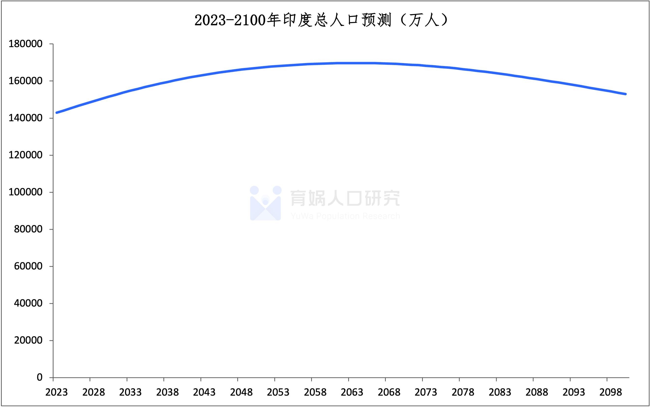 2023年印度总人口为14.3亿,印度总人口达到峰值的年份是2064年,峰值人口为17亿。此后,印度人口步入缓慢下降的历程。到2100年,印度总人口为15.3亿。