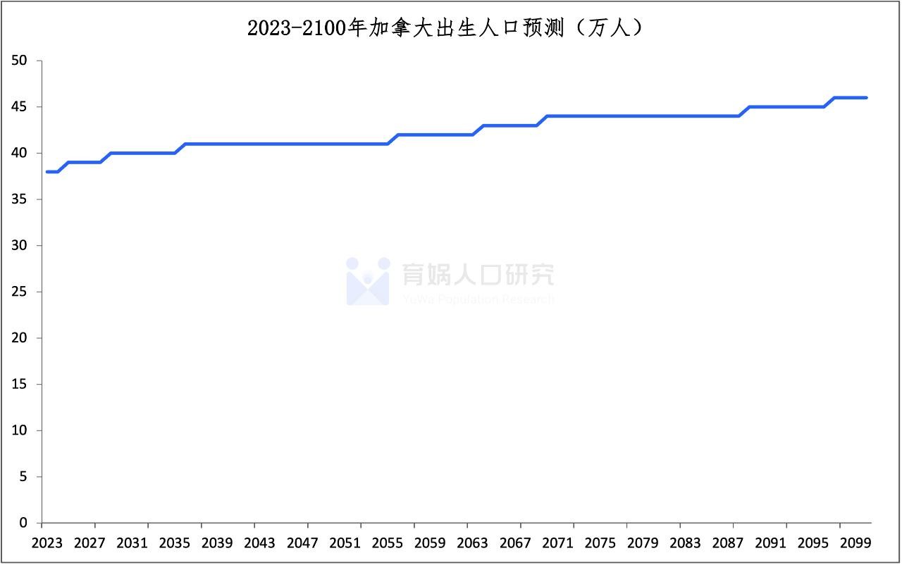 根据上述预测,从2023-2100年,加拿大出生人口从38万缓慢上升到46万。