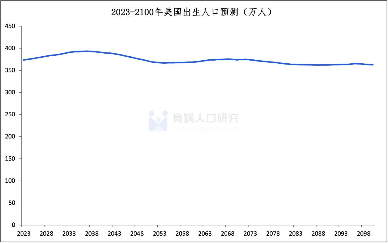 根据上述预测,从2023-2100年,美国出生人口在360万至395万之间波动,2050年出生人口为370万,2100年出生人口为363万。