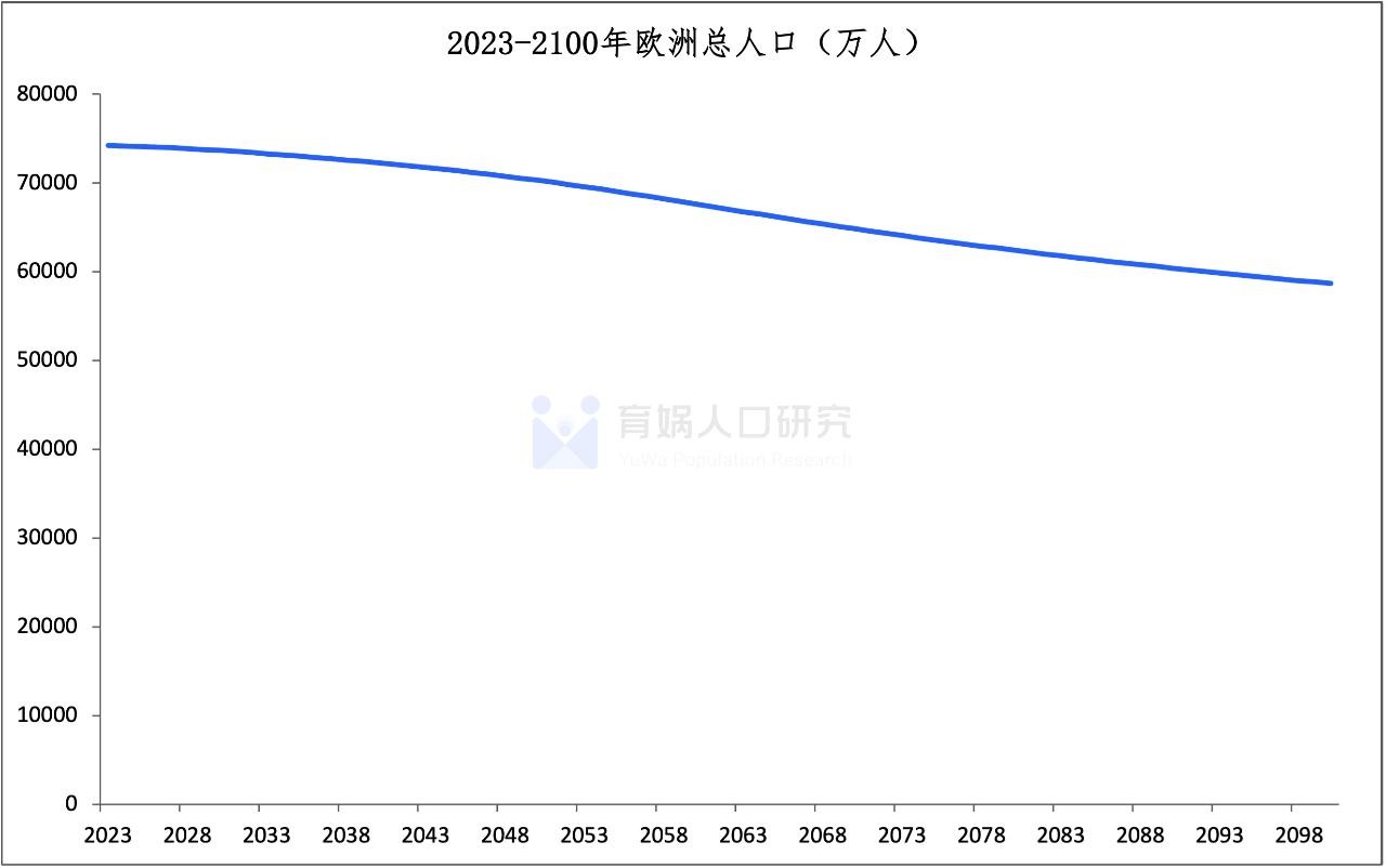 根据上述预测,欧洲总人口从2023年的7.4亿缓慢下降至2100年的5.9亿。