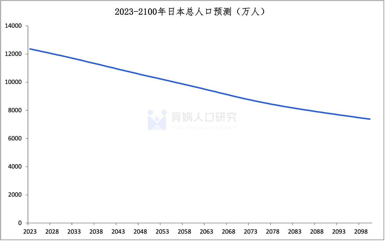 2022年日本总人口为1.24亿。下图是2023-2100年日本总人口预测: