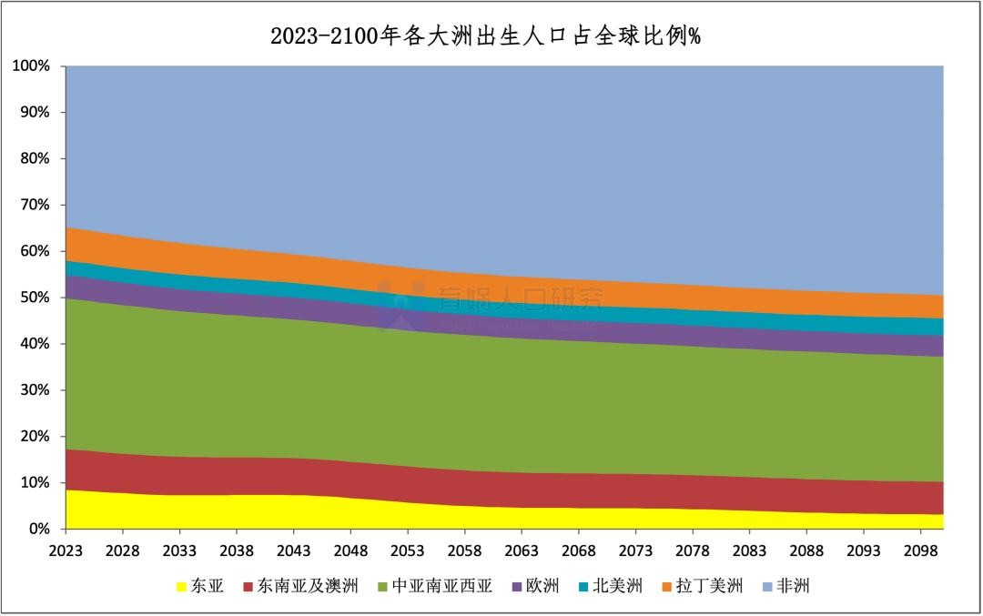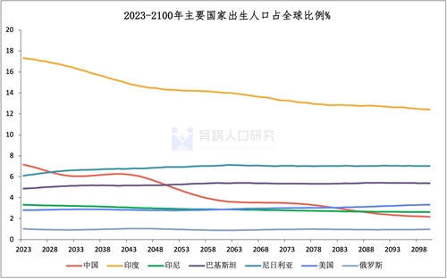 下图是2023-2100年主要国家出生人口占全球比例预测: