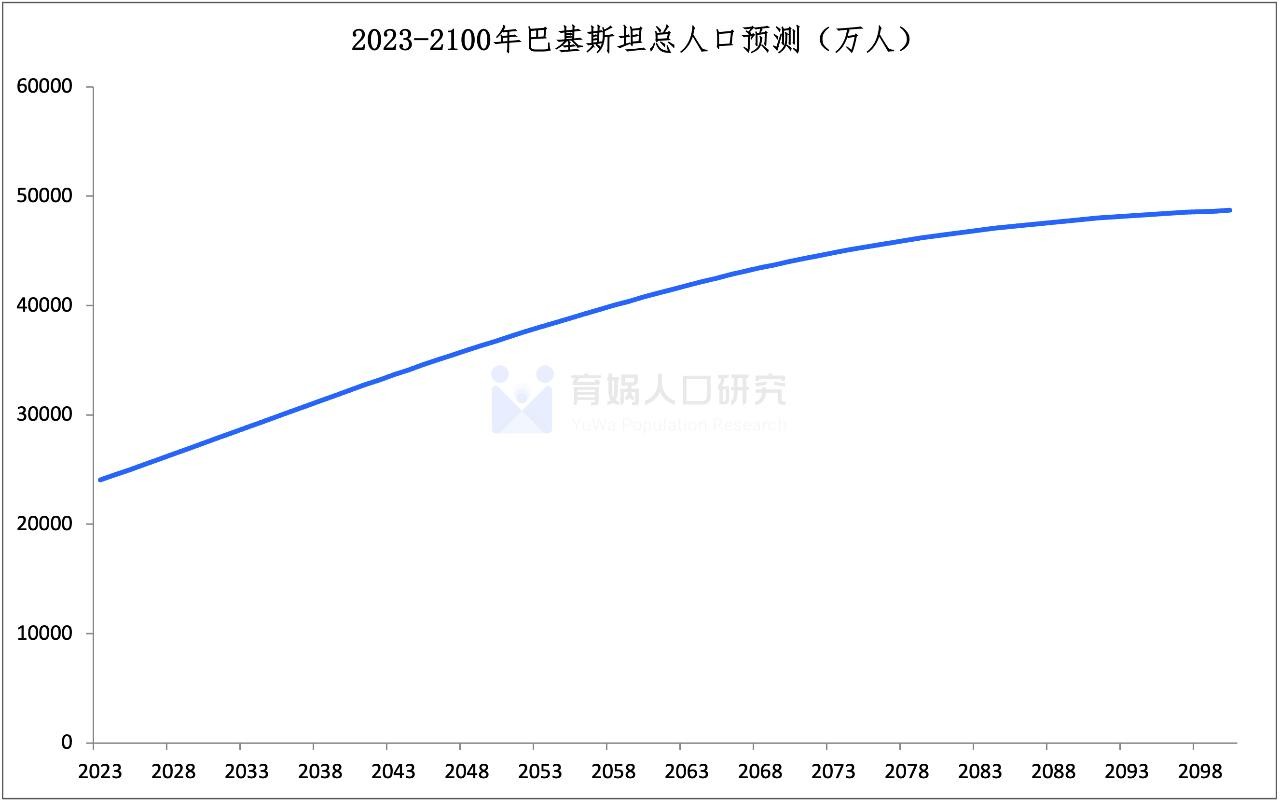 根据上述预测,从2023-2100年,巴基斯坦总人口从2.41亿上升到4.87亿。