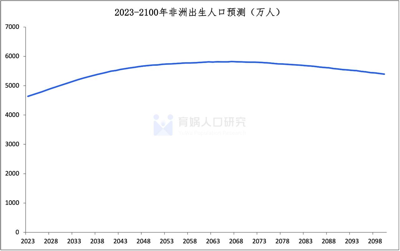 根据上述预测,从2023-2067年,非洲出生人口从4636万逐步上升到5820万,随后缓慢下降,到2100年,非洲出生人口下降至5394万,占全球比例为49.5%,接近全球出生人口的一半。